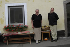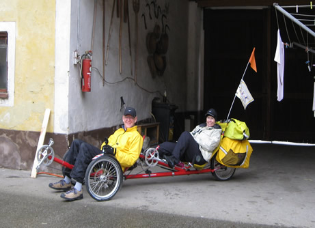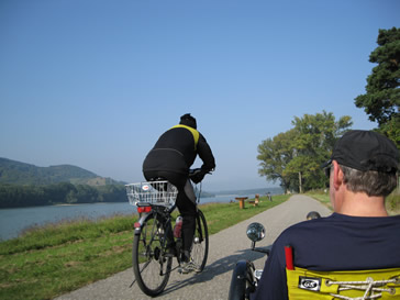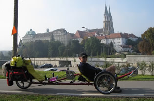 If this is your first time to visit my site, you'll notice that the vehicle we ride is not your ordinary bicycle. Our touring ride of choice is a tandem recumbent tricycle built by the Australian manufacturer Greenspeed. The trike was built to measure for us and is designed to disassemble to allow air transport. For more information about the trike, click here. For more about our touring philosophy click here. Bike Touring, Practicalities, and This Trip... There are a number of ways to approach cycle touring, from the fully-catered, scheduled, guided group tours, to the totally unstructured "just ride around and take your chances" trip. Our system is somewhere in between. The key is having a skilled planner like Jayne. Give her an area, a stack of guidebooks, and the internet, and in no time she will have an itinerary that not only gives us excellent focus on the area, but has flexibility to accommodate contingencies such as mechanical failure or illness. We know when and where the tour starts and ends (Vienna), we know what direction(s) we want to go (west, then north), and have a general idea of where we'll stay each night, usually based on guidebook listings/recommendations. When we're telling someone about our cycling trips, common questions are: "How far do you ride?" and "How can you ride so far each day?" The answer is pretty simple: we plan to ride about 40-50 miles per day, but we're not fanatics about it. For a touring trip, we plan to average around 10 miles per hour, so we're looking at 4-5 hours on the bike per day, but in reality, each day is a series of relatively short rides. A typical day goes something like this: breakfast at the hotel/b&b, on the road by 9 am or so. Ride an hour. Stop - see some local attraction, or have second breakfast. (10 miles gone). Ride an hour or so (15 more miles). Stop for lunch. Ride an hour (10 miles more). Stop to see sights, have a snack, check map and guide book for next town with accommodations. (If it's hilly, or there are interesting sights to see or wine to taste, we'll stop more frequently.) Ride an hour (total 45 miles) to destination town, locate information office or signboard (look for the blue sign with a white i on it), find hotel or b&b, check in, see sights, eat dinner, sleep, repeat. Our route takes us approximately 200 miles along the Danube river, one of the most popular long-distance cycle routes in Europe, then we go north another 70 miles or so into the Czech Republic. The primary claim to popularity of the Danube route is that it is essentially flat, making it an easy ride for inexperienced cyclists. Even though our trip was scheduled to avoid the worst of the tourist season, there were still a number of touring cyclists on the route, though, as we discovered, some of the amenities (such as ferries) are seasonal, and we missed the season. Though the towns and villages in Austria are not as close together as in France, the long history of human habitation along the Danube does mean that you're generally not more than 5 - 6 miles from some type of settlement, but much of the route does follow the woodlands and farm fields, so for us, it was not uncommon to ride for some time without seeing other cyclists. We did however, see our share of wildlife, including pheasants and the fire salamander pictured below. As always, Jayne was well-prepared with guidebooks, though some of the guides we needed were only available in German, we were able to make do, though our lack of fluency did result in some problems. On the Bike... We departed Vienna after breakfast on Sept 28 with clear skies. Despite a couple of stops to make minor mechanical adjustments, the ride was uneventful, though it seemed to me that the distances on the bike computer were off. The first leg, to Krems, was supposed to be about 45 miles. After covering 77 miles, we discovered that distances cited in the guides presume the rider will stay on one side of the river - crossing the river to see interesting towns can add substantially to one's travel distance. We won't ma In Krems, we stay at a hotel in the center of town, the Alte Post. This is likely one of the creepiest hotels we've Day 2 was a repeat of Day 1 - clear skies, moderate temperatures, and easy cycling along the river. Every few kilometers brings a new village with either a castle, an interesting church, or both. Today's route takes us past a number of vineyards and the Mauthausen concentration camp. The vineyards were stilll pretty, with some grapes still on the vine. We missed the turn to the camp, and were almost to Grein before we realized our mistake. Just as well, it was a steep climb and I was starting to have some discomfort in my right Achilles tendon. Strangely enough, I didn't make a note of where we stayed or ate in Grein, but I can only assume we had an uneventful stay. Our plan for Day 3 was to do a shorter ride to Linz, which is slated to host a major cultural festival next year. Despite the season, the town is full of tourists that alight from the large river cruisers that run regularly up and down the Danube. Unfortunately, to prepare for the festival, the good citizens of Linz are busily sprucing up the city, which in this case means tearing up most of the streets in the central city. Combine the construction with a lack of hotels that could provide secure storage for our bike, and we decided that Linz was not for us, and we would push on to the west. According to the guidebook, there were accommodations in the next village, Puchenau, so after a lite lunch at a kabob stand, we push on to Puchenau. We know there's a b&b here, finding it is the challenge. We make a stop at the local grocery store to pick up snacks, and a local lady directs us to the b&b: "J