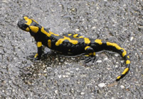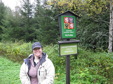 Today's plan was to follow the riverside bike path for a while, catch a ferry that would take us past an area with no bike path, then turn north, heading for the Czech Republic. The combination of weather and rural location gave us our first sightings of wild pheasants as well as the unusual fire salamander pictured. October 2, another cold day, but we're warmed by the climbing - and climbing - and climbing. The good thing about riding a tricycle is that you can Aigen is an interesting town - there are major hiking routes throughout the area, and the town seems to cater to the outdoor and health enthusiast. In addition to hiking and running route maps posted everywhere, several hotels and businesses offer various spa and medical services to weary travelers. We stop at a pharmacy and pick up some antihistamines for Jayne's runny nose and I get an elastic ankle brace. When we were looking at potential routes from Aigen to Czesky Krumlov, we were perplexed that There's a little surprise as we depart the next morning. The first kilometer is downhill, giving us a The closer we get to the border, the more rural the area becomes, until the road becomes a paved track through the forest, which is somewhat exciting as the road is mostly downhill, and rough. Somewhere in the border region we lose our "Life is Good" flag. And then, finally, the border.