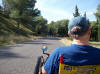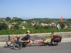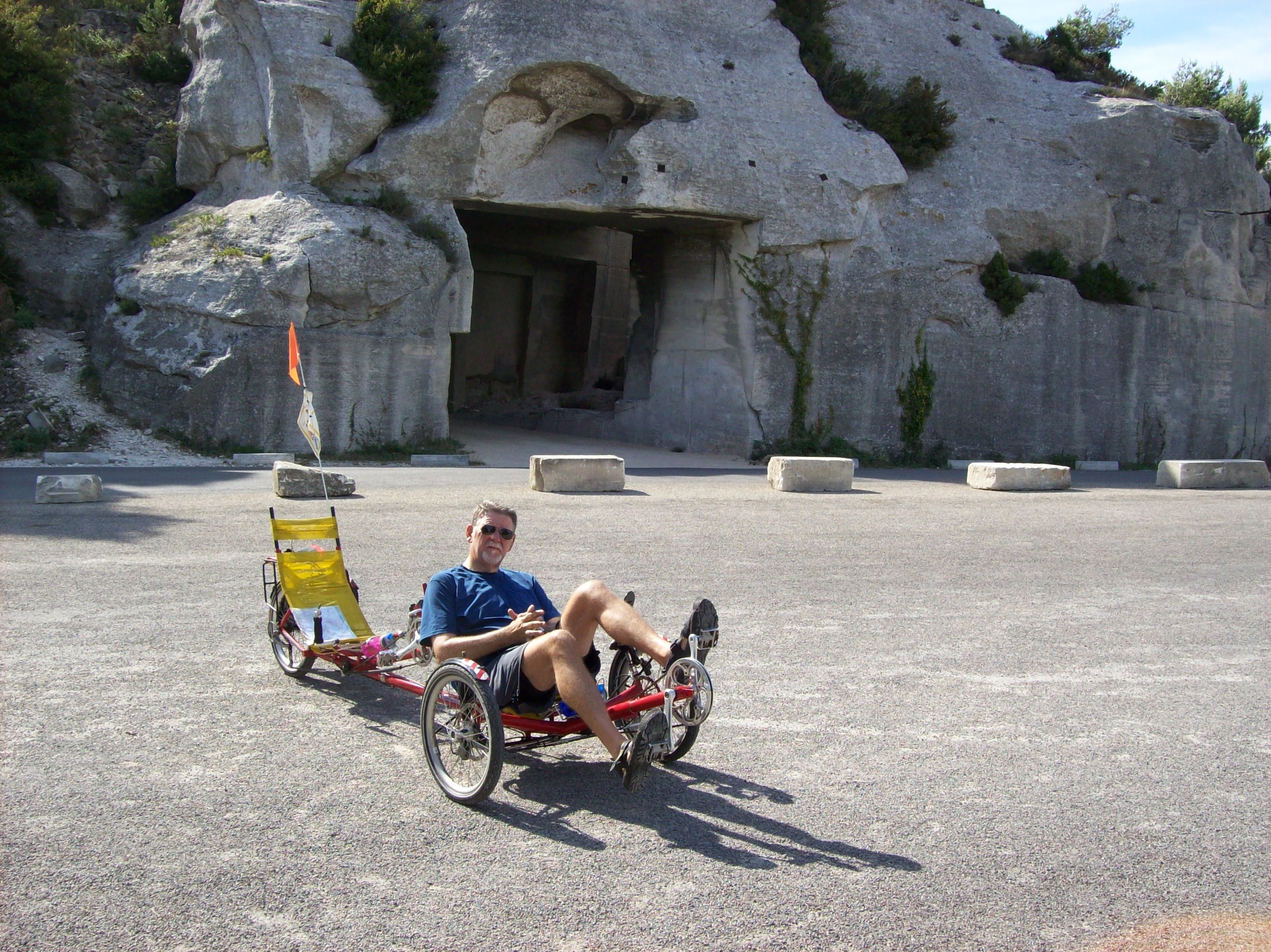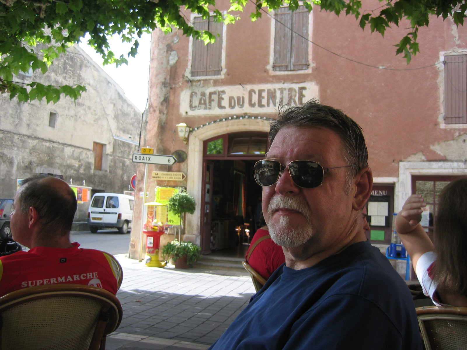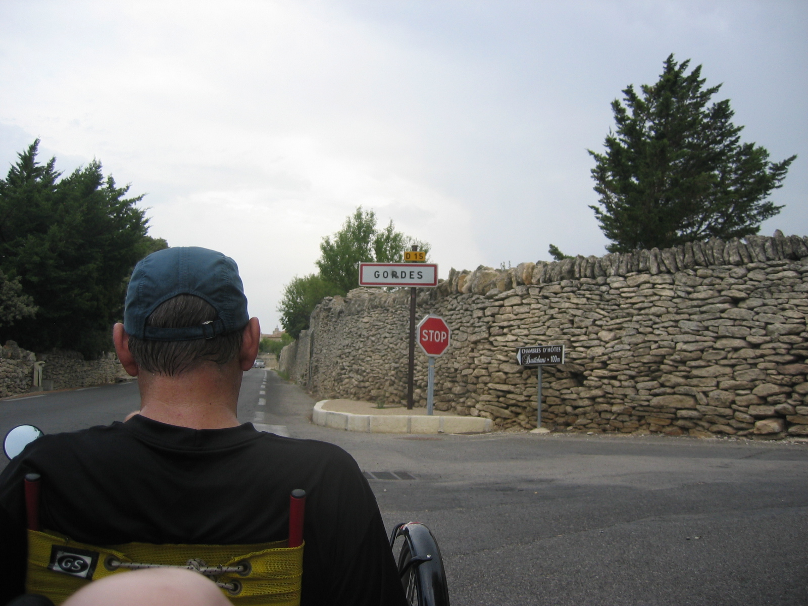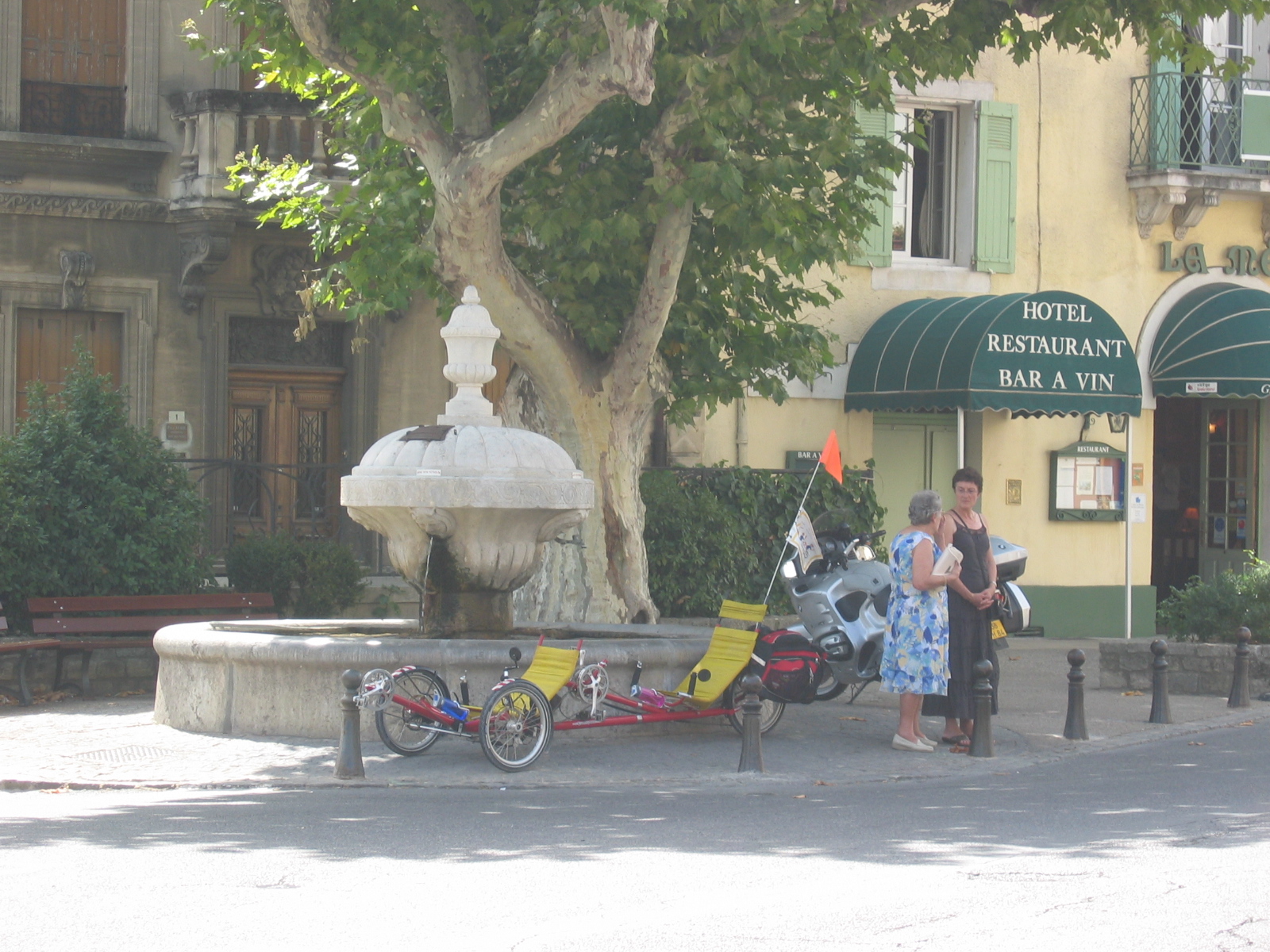 miles from Isle sur Sorgue. The first few The ride out of Gordes is loads of fun. With the upgraded brakes and lighter load, we can afford to let the trike pick up a bit more speed (we hit 42.5 mph on this run), so we cover a lot of ground quickly. Passing through a small village, we spot a small restaurant with it's front door open. There are only 6 or 7 tables, but it's cozy, and the waitress speaks fluent English. The plat du jour is excellent, and we linger over our roses for a while before continuing the return. Dinner at the hotel is essentially a reprise of last night. Lucky we're only here two nights - one more and we'd be out of options for dinner Thursday, August 30: Isle sur Sorge to Avignon, 28 miles The ride back to Avignon is relatively easy, despite continuous