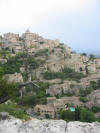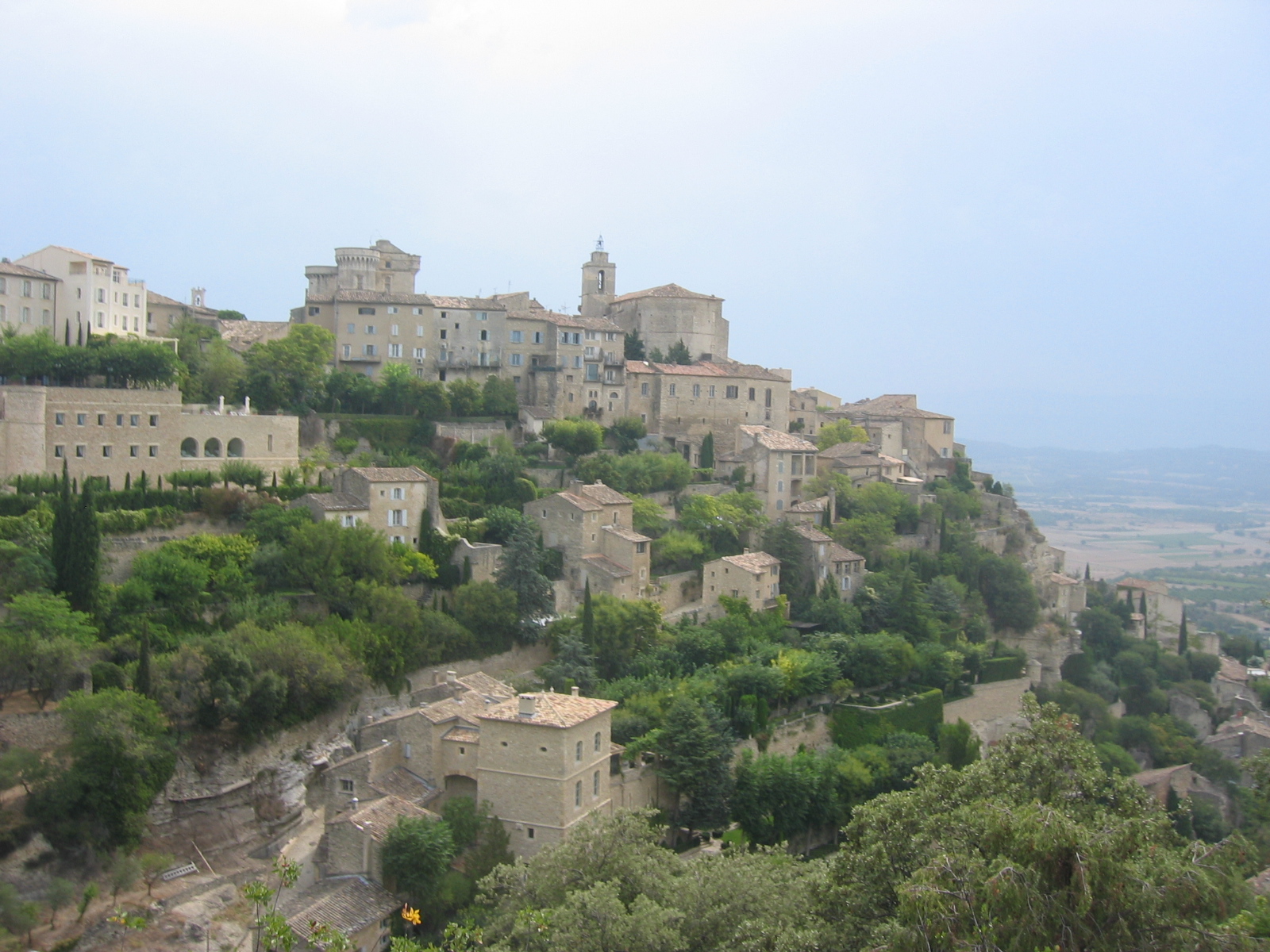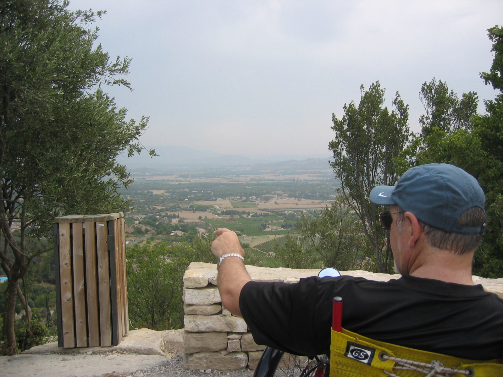 We stop at a wine co-op to buy a $5 bottle of Rose. They have a self serve station, where you bring your own bottles to fill your wine. The wine is priced by the liter. One of them is free (we didn't taste it, but how bad could it be? ). I love France! Regardless, we make good time today, arriving at our hotel for the next two nights (a Best Western - with two swimming pools) well before our luggage. Since the hotel is about a mile from the center of town, we hop back on the bike and check out the old town. The central city is surrounded by a canal featuring several waterwheels that were once used to power mills and other machinery. Today, the canal is Isle sur Sorgue's version of the River Walk. Jayne picks up another phone charger and we have lunch at a cafe overlooking the canal. Back at the hotel, still no luggage, despite calls to France Bike. Oh well, it's hot, we're sweaty, there are two swimming pools, and bike clothes work as swim wear. A dip in the pool, a couple of chapters in a cheap novel, and just about the time my shorts get dry, our luggage arrives. Tonight's dinner (included in our tour package) in the hotel restaurant is our choice from the standard 20 - euro 3-course (entree, main, dessert), that we supplement with a local rose'. Wednesday, August 29: A Day Trip to Gordes, 27 miles We'll climb a bit today on our visit to the town of Gordes - about 12