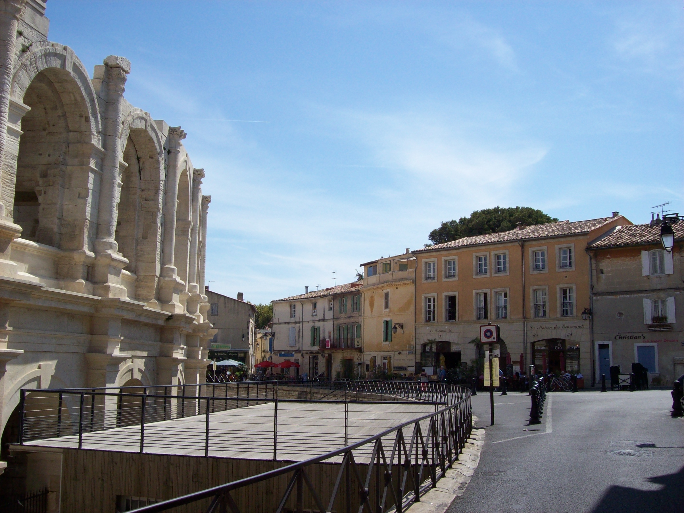 We'll use this stopover to prep for the next week of touring (laundry and more maps), and tour the Pope's palace. During the palace tour, we discover the need for another chore - our trusty Canon digital camera bites the dust, so a visit to the local FNAC (sort of a combo between Border's Books and Best Buy - without the large appliances) is in order. The Kodak is functional, but I miss the Canon. Friday and Saturday, August 31-September 1: Avignon Friday's dinner is on our own, so we decide to try something that is... not French. We had seen some Moroccan restaurants in the neighborhood, so decide to give one a try. The meal is OK, but the next morning, I wake up with GI distress, but I figure things will be better by the next day. For our Saturday day trip Jayne has arranged for a Wine Safari. Mike Rijken, a former chef and winery marketing director, picks us up at our hotel. We'll start with lunch near the vineyards, then Mike will take us on a tour that will encompass the vineyards and wineries of the central Cote du Rhone. With Mike's insider access, we get up close and personal at the Tavel cooperative, watching the delivery and crush of freshly harvested grapes, and get a sample of the first run of juice. Following the cooperative visit, Mike takes us to two small wineries where we get to meet the winemakers and taste a variety of wines. There's been a change in the weather. It's cooled off, with daytime temperatures now peaking around 80, and the wind has picked up. Well, "picked up" is a misnomer. In Texas, we'd call 50 mph winds blowing for days on end a Tropical Storm. In Provence, it's the Mistral. Mistral – the Winds that Drove Van Gogh to Madness The mistral are winds that blow from the north at 80-100 km (sustained) for 100 – 150 days a year in Provence. Winds so strong they rattle windows, slam doors, make buildings groan and drive the French away from their beloved outdoor squares and bistros. Winds that blow not only in the winter, as we believed, but all year around. Winds that blew us out of Provence. Why do the vineyards of the Cotes du Rhone look like a briar patch? The mistral forces vineyards to thrive without trellising. The wind would blow them over and after all, French vines must suffer to produce their superior wines! Why are there no church steeples for us to use as a compass from village to village? The mistral forces churches to be built without steeples. Wrought iron steeples are a local architectural detail, designed to withstand the wind, but not visible from 4-6 km as is the average steeple. Why are there no window boxes overflowing with flowers in Provence? The mistral forces window boxes with flowing flowers to be abandoned to the wind. How did we cycle into the mistral? Very slowly. Not quite as slow as a steep climb – but as unpleasant as cycling in the driving rain. Constant. Unrelenting. Miserable. After 30 miles cycling into a 50 mph headwind back to our base in Avignon, we decide to abandon Provence and the mistral for the remainder of our trip and head north to Burgandy with its trellised vines, tall church steeples, and window boxes overflowing with flowers… and no wind. Sunday, September 2: Avignon to Arles, 31 miles Sunday dawns with