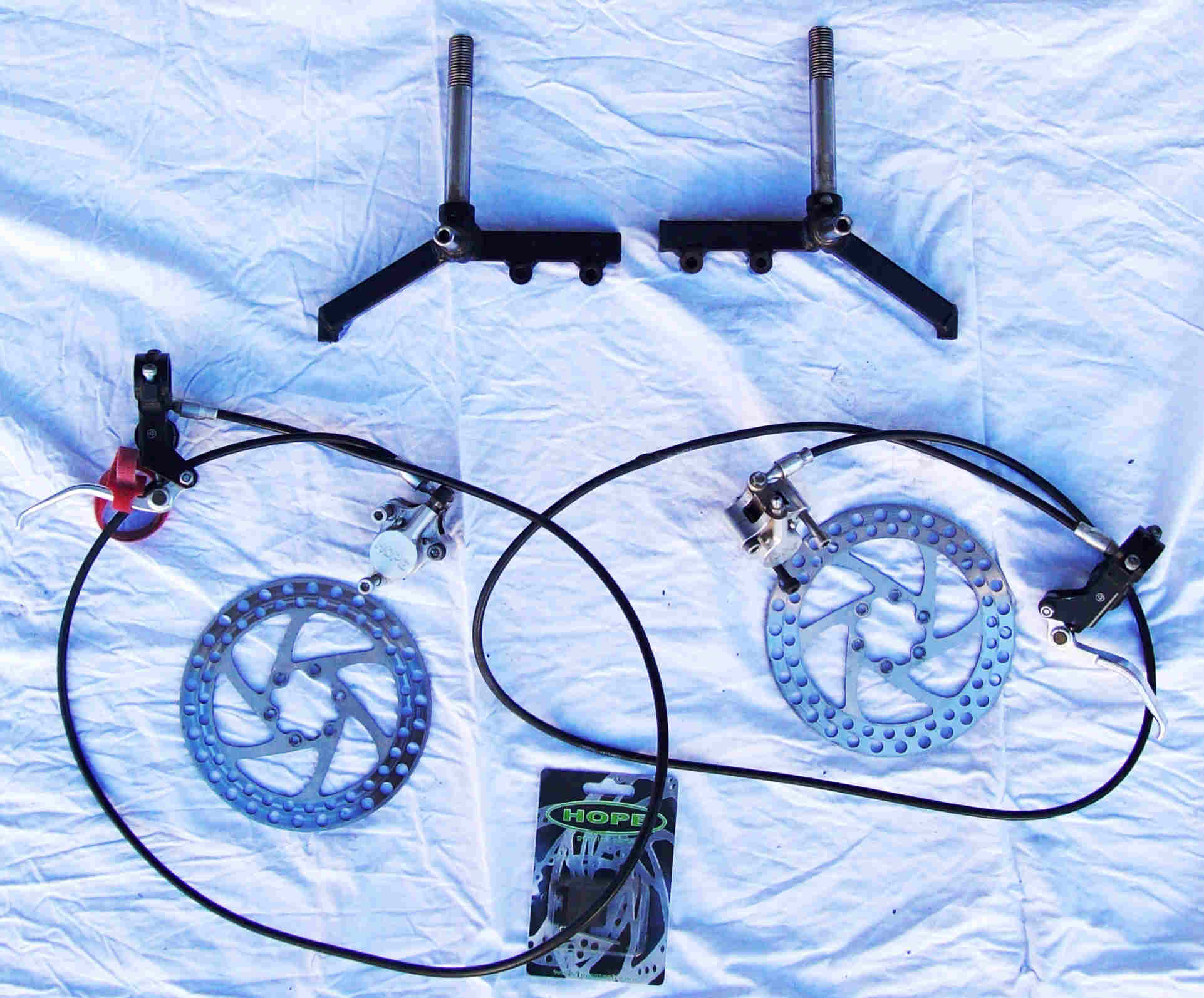 We upgraded the brakes on our GTT from the stock Hope C2 hydraulics, which required a kingpin replacement. These kingpins and brakes are the original, and accumulated around 4000 miles. The rotors have around 500 miles on them, as do the pads. Assorted Greenspeed parts, from the GTT...