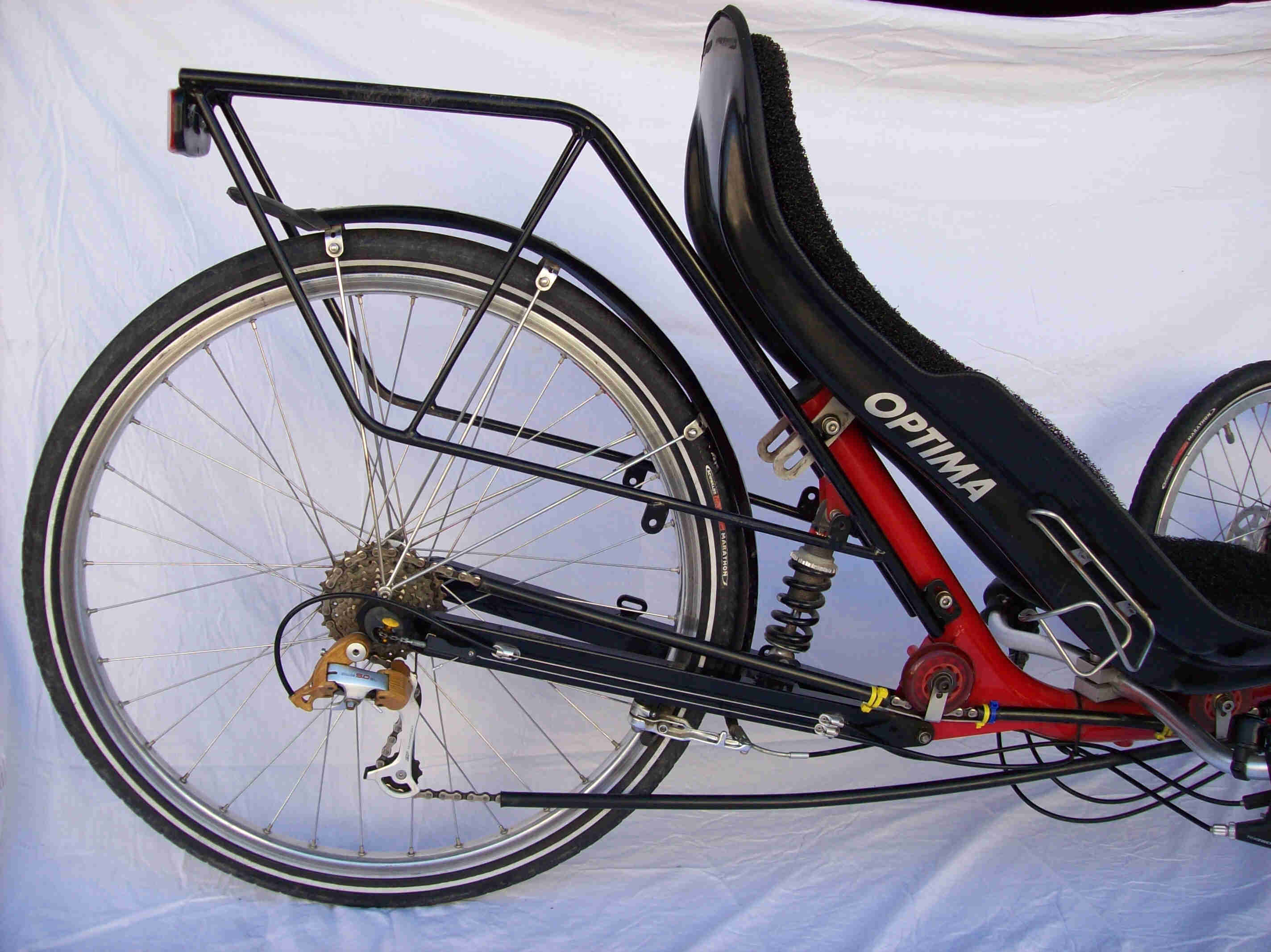 Trike Updates January 2, 2002: Since we bought the Greenspeed tandem, I haven't put a lot of miles on the Optima - have about 2100 miles to date. Finally have the alignment dialed in. Replaced the original rear tire with a Schwalbe Marathon 26 X 1.5 @ 2000 miles. Added an Air Zound horn - it's really loud. July 12, 2001: The Primo Comets only lasted around 200 miles (primarily due to the soft rubber composition, but alignment is still a bit off). I added a new set of Schwalbes and they have done OK through the first couple of hundred miles. Mileage to date: 1810 May 8, 2001: The Schwalbes finally packed it in during Cycle Main Street. The bike guy only had a set of Kevlar Primo Comets, so we'll see what happens. Wear on the right is still worse than the left - must continue to adjust alignment. Did a bit of preparation before going on this tour: I've had two chain idlers fracture since new, so I had a couple of rollerblade wheels machined into rollers and added a second idler as Optima does with the Riders with the front triple chain ring. The new idlers are much quieter and seem to roll better too. My friend Perry Templeton has made a new seat cover for me - it worked alright, but we're working on a new design that should be even cooler. Longest ride to date: 83.83 miles during Cycle Main Street. Around 1400 miles on the odometer. February 21, 2001: Replaced the tires with Schwalbe Marathon (20 X 1.5). These tires seem to be more substantial than the Schwalbe City Jets and sport Kevlar lining. Unfortunately, they barely fit under the fenders - and will probably force me to come up with a new fender solution. Alignment seems to be holding, and with around 100 miles accumulated, wear is minimal. Did my longest trike ride to date (40 miles) with the Austin Cycling Club. January 28, 2001: 586 miles on the odometer (mostly riding in the city of San Antonio, with a few club rides thrown in) and the front tires are worn to the casing. Time to shop for new tires... and speaking of tires and wheels, after a total of 5 broken spokes on the front, the wheels went in for a rebuild - don't know whether the breakage was due to a bad build or my riding style. Otherwise, things are going well, though the seat bolts have a tendency to work loose. I didn't like the thickness of the seat pad, so I've purchased some open-cell foam and have cut it to fit the seat. Once it's dialed in, I'll have a cover made. New accessories: water bottle cage attached to right side of seat, panniers (Performance brand cheap-Os), and an Arkel utility basket for groceries.